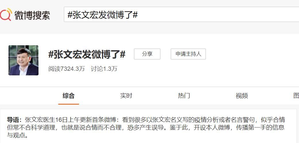 荔枝新闻讯 5月16日,复旦大学附属华山医院感染科主任张文宏开设微博,并发了第一条博文说到:看到很多以张文宏名义写的疫情分析或者名言警句,似乎合情但常不合科学道理,也就是说合情而不合理,恐多产生误导。鉴于此,开设本人微博,传播第一手的信息与观点。