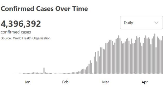根据世卫组织最新实时统计数据,截至欧洲中部夏令时间5月16日10时04分(北京时间5月16日16时04分),全球确诊新冠肺炎4396392例,死亡300441例,中国以外超过431万例。