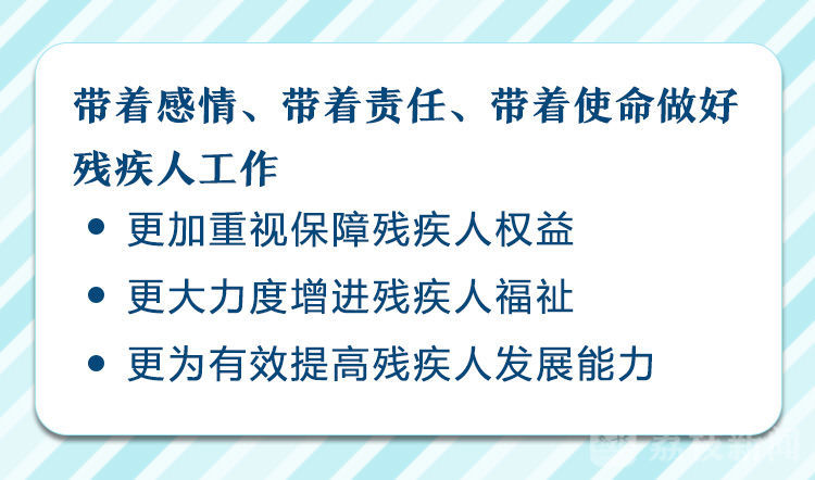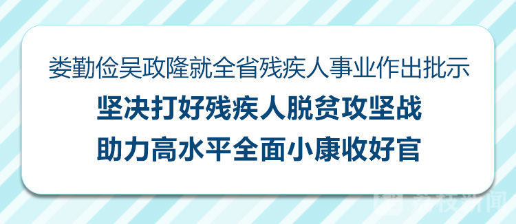 娄勤俭强调,今年是全面小康收官之年,帮助贫困残疾人增收脱贫,对全省决胜高水平全面小康具有标志性意义。各级党委政府和残联组织要认真贯彻习近平总书记“全面建成小康社会,残疾人一个也不能少”的指示要求,带着感情、带着责任、带着使命做好残疾人工作,更加重视保障残疾人权益,更大力度增进残疾人福祉,更为有效提高残疾人发展能力,坚决打赢残疾人脱贫攻坚战,确保广大残疾人同步迈入高水平全面小康社会。