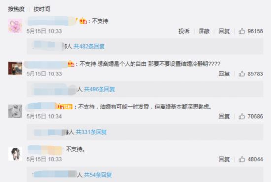 值得注意的是,近期微博上发起了一项关于“民法典草案拟引入离婚冷静期,你支持吗?”的投票,引来了上万人的评论与转发,但大多数的网友均表示“不支持”。