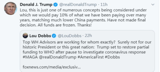 在推文中,特朗普还写道:“尚未做最终决定。所有的资助仍被冻结。”