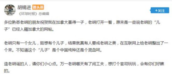 (原标题:网传胡锡进在加拿大喜得一子,本人回应:谣言)