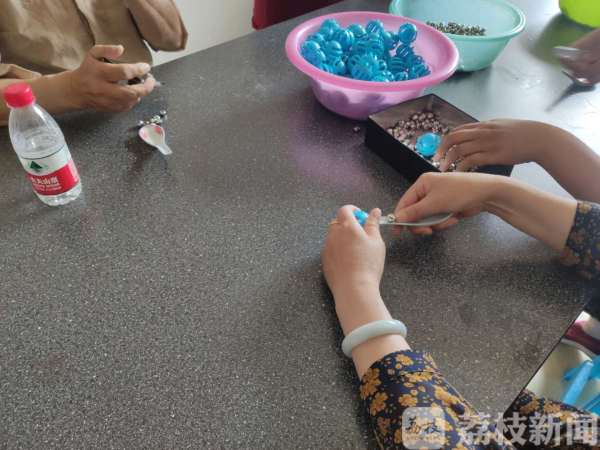 在工场的另一个房间,孔德云正在耐心的教女儿如何串小铃铛。这些铃铛都是一家宠物饰品厂委托学员们制作的。孔德云说,女儿患有脑瘫,动手能力一直不好,串铃铛这个工作非常简单,不仅能锻炼女儿的动手能力,还能挣点钱,每月女儿自己挣的够她自己花销,缓解了家里的经济压力。像孔德云这样陪护孩子的家长,在君子残疾人之家还有很多。学员家长李蓉更是发挥自己的缝纫特长,制作了抱枕、布袋等手工产品。在照顾孩子的同时,也给自己找到了一份工作。