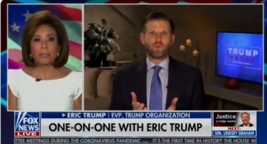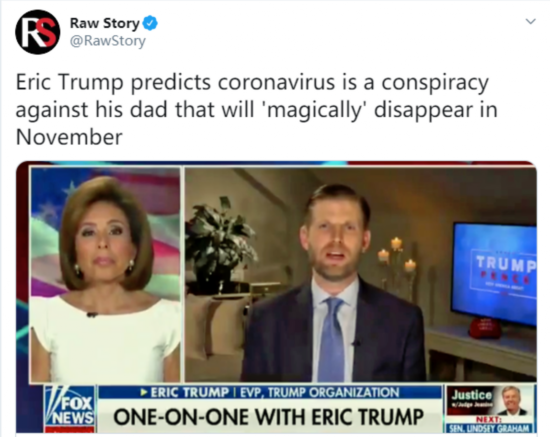 “所以你瞧着吧,从现在开始到11月3日(大选日),他们每一天都会不断利用这个局势。但你猜怎么着,等到了11月3日之后,冠状病毒会突然神奇地消失的,然后所有人就都能出来了。他们就是想夺走我父亲最重要的资产,即美国人民对他的爱戴”,他说。