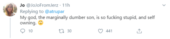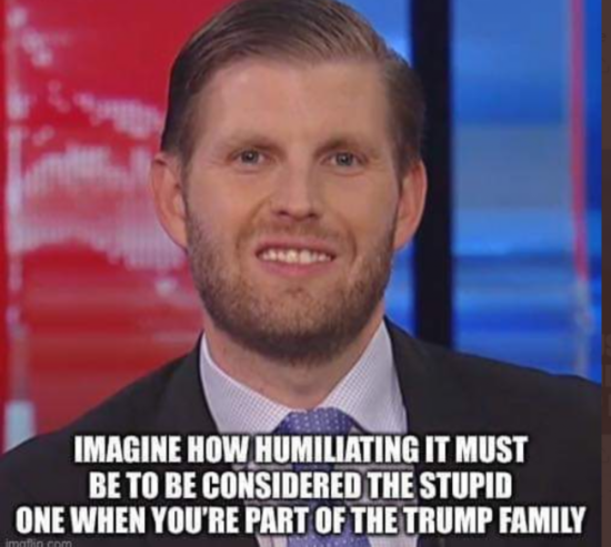 还有些美国网民干脆直接攻击起埃里克来,说他真是一个“蠢到家”的儿子,并贴出了一个表情包,上面写着:“在特朗普家还能被视为是最蠢的人,想象一下这得有多羞辱吧……”