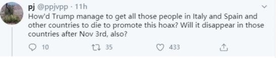 一个获得400多个点赞的留言则质问说:既然特朗普说这是场骗局,那意大利和西班牙那么多人又是因为什么病死的呢?这些国家的疫情会不会也在11月3日之后消失呢?