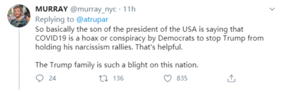 其中,一个获得835个点赞的留言就写道:“所以这位美国总统的儿子是在说新冠肺炎只是一场美国民主党用来阻止他父亲去搞竞选集会的骗局或阴谋。他们一家人可真是这个国家的祸害啊。”