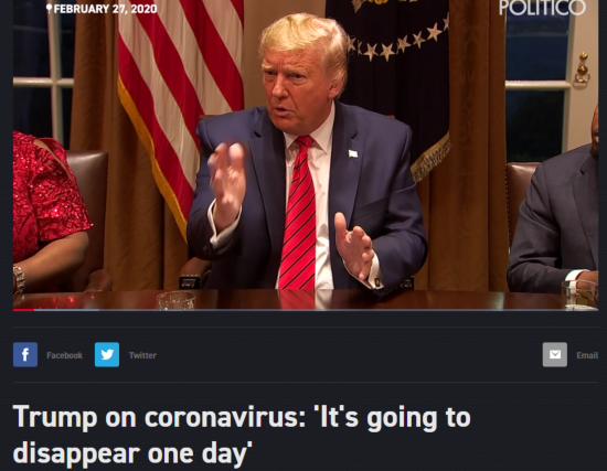 此前,特朗普本人曾在今年2月28日“淡化”疫情对美国的威胁时,说出过类似的话。当时他说“有一天,新冠病毒会消失的,就像奇迹一样,会消失的”。