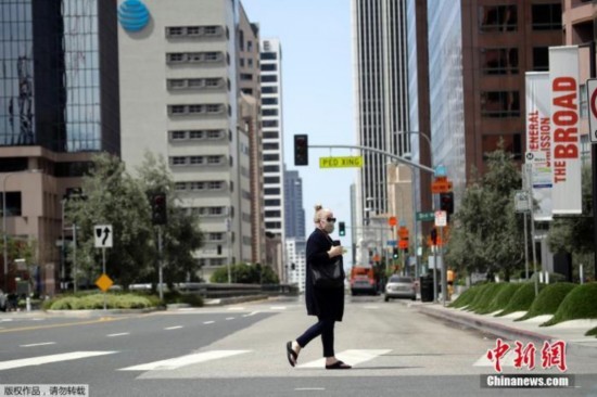 当地时间5月13日,洛杉矶市长加希提宣布,为了保障安全,人们只要出门就必须戴口罩。图为洛杉矶街头戴着口罩的市民。