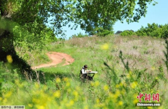 当地时间4月15日,意大利12岁的朱里奥·吉奥瓦尼尼因家中没有网络,把桌子搬到山坡上参加网络在线课程学习。