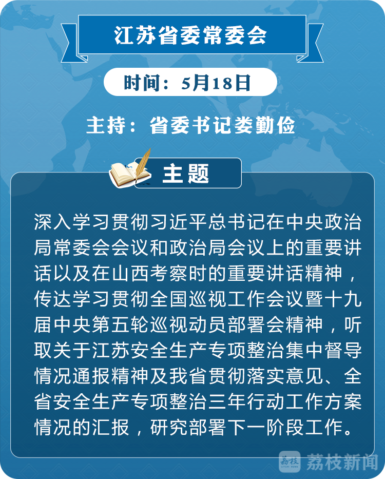 荔枝新闻讯 5月18日,江苏省委常委会暨省委应对疫情工作领导小组召开会议,深入学习贯彻习近平总书记在中央政治局常委会会议和政治局会议上的重要讲话以及在山西考察时的重要讲话精神,传达学习贯彻全国巡视工作会议暨十九届中央第五轮巡视动员部署会精神,听取关于江苏安全生产专项整治集中督导情况通报精神及我省贯彻落实意见、全省安全生产专项整治三年行动工作方案情况的汇报,研究部署下一阶段工作。