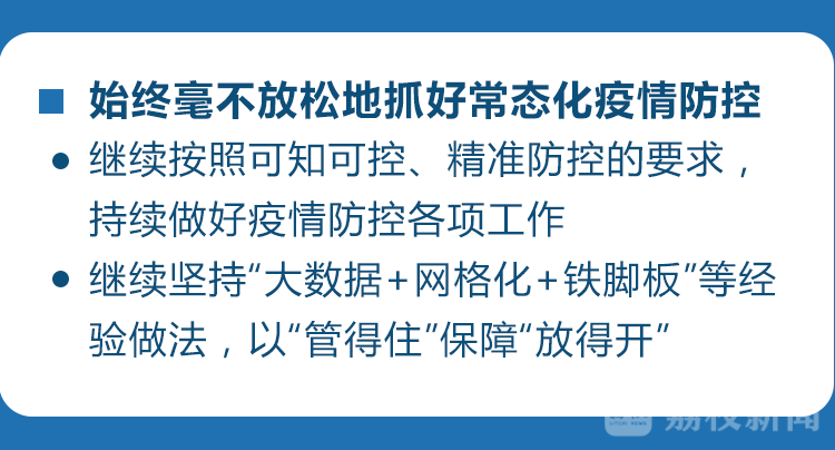 会议强调,虽然我省疫情防控形势持续向好,但要充分认识到外防输入的压力还比较大,内防反弹的风险一直存在,必须坚决克服麻痹思想、厌战情绪、侥幸心理、松劲心态,始终毫不放松地抓好常态化疫情防控。要继续按照可知可控、精准防控的要求,持续做好疫情防控各项工作,对防控漏洞再排查、防控重点再加固、防控要求再落实,特别是要根据夏季天气特点完善防控举措,教育引导群众做好科学防护,有针对性地落实学校、医院、室内场馆等重点场所的防控措施。要继续坚持“大数据+网格化+铁脚板”等经验做法,以“管得住”保障“放得开”,绝不能让来之不易的防控成果前功尽弃。