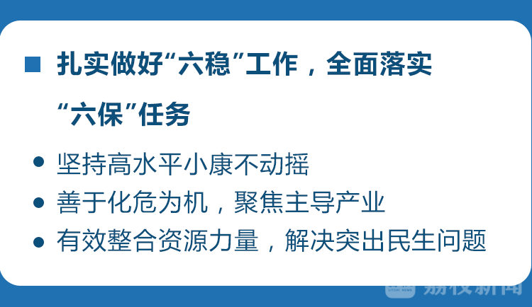 会议强调,要在常态化疫情防控前提下,坚持稳中求进工作总基调,坚持新发展理念,扎实做好“六稳”工作,全面落实“六保”任务,奋力推动高质量发展。一是坚持高水平小康不动摇,进一步巩固提升建设成果,扎实推进苏北农村住房条件集中改善,努力解决农村发展中的薄弱环节、短板问题,促进整体发展水平提升;二是善于化危为机,聚焦主导产业,加快实施产业基础再造和产业链提升工程,全面提升产业链供应链稳定性和竞争力;三是有效整合资源力量,解决突出民生问题,同时以民生水平的不断提升更好地扩大内需、拓展空间、拉动增长、培育动能。