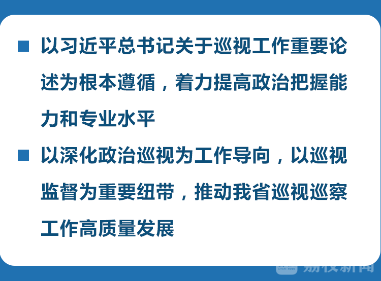 会议研究了我省贯彻落实全国巡视工作会议暨十九届中央第五轮巡视动员部署会精神的意见,强调要以习近平总书记关于巡视工作重要论述为根本遵循,切实加强巡视巡察工作的规律性认识和创新性实践,着力提高政治把握能力和专业水平。要以深化政治巡视为工作导向,以巡视监督为重要纽带,围绕中心大局,聚焦重点任务,加强巡视巡察机构与组织、审计、信访、统计等职能部门的协作配合,推动巡视巡察监督与其他监督贯通融合,督促各级党组织和党员干部坚决贯彻中央决策部署,推动我省巡视巡察工作高质量发展。