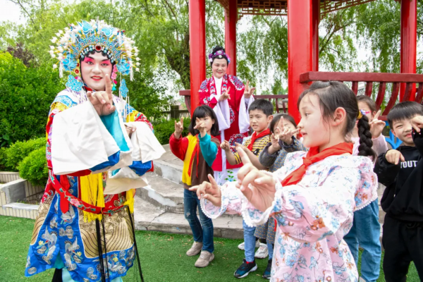 演员们时而唱腔优美引人倾听,时而莲步轻挪长绸飞舞,时而战鼓声声刀光剑影,剧情跌宕起伏,表演丝丝入扣,尽显戏曲魅力。悠扬婉转的唱腔,专业娴熟的演艺技巧,使孩子感受到了中国传统文化的魅力。