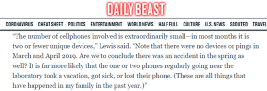 至于MACE报告中提到的手机定位数据在10月中上旬减少的问题,《每日野兽》发现这报告所依据的仅仅是不到7部手机的定位数据,甚至很多时候依据的只是一两部手机的定位数据。《每日野兽》采访的数据分析专家就指出,这个极低的样本量根本就说明不了什么,更别提去证明武汉实验室发生了什么“事故”了,最多只能说明出现在武汉病毒所附近的这极少量的手机用户,可能是生病了、休假了、或是没定位/没开机/手机丢了等等。
