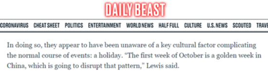 《每日野兽》还怀疑MACE的这份对武汉病毒所疑神疑鬼的报告,可能连中国10月的第一周是“黄金周假期”都不知道。