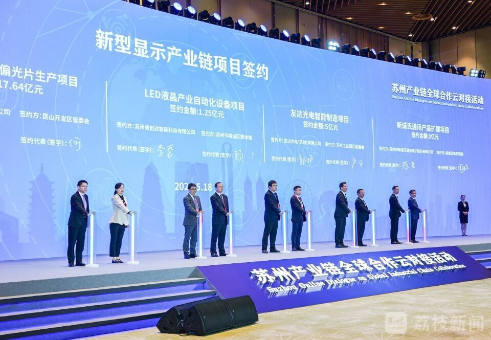 江苏省委常委、苏州市委书记蓝绍敏说,我们今天的活动,就是要实现“链接苏州,就是链接世界、链接未来”。现场来自生物医药、软件集成电路、汽车及零部件、智能装备、新型显示5大产业链的学界、业界、商界精英人士齐聚苏州,线下对接。苏州5大产业链进行了订单签约,项目和订单总额近4000亿元,迈出了产业链全球合作的第一次“云中漫步”。友达光电、快捷半导体等六家企业作为代表,线上与海外合作商进行了视频供需对接。