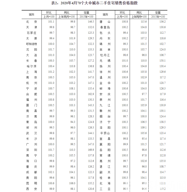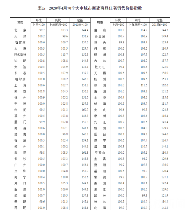 2020年4月全国70个大中城市中,北京、厦门、武汉等11个城市新建商品住宅价格环比下降,宁波、济南、广州、深圳等9个城市新建商品住宅价格与上月持平,其余50个城市环比上涨。随着我国新冠肺炎疫情防控向好态势进一步巩固,经济社会秩序进一步恢复,因疫情积压的住房需求进一步得到释放。70个大中城市房地产市场价格延续微涨态势,但总体仍较为稳定。