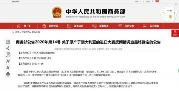 根据《反倾销条例》第三十八条规定,商务部向国务院关税税则委员会提出征收反倾销税的建议,国务院关税税则委员会根据商务部的建议作出决定,自2020年5月19日起,对原产于澳大利亚的进口大麦征收反倾销税。