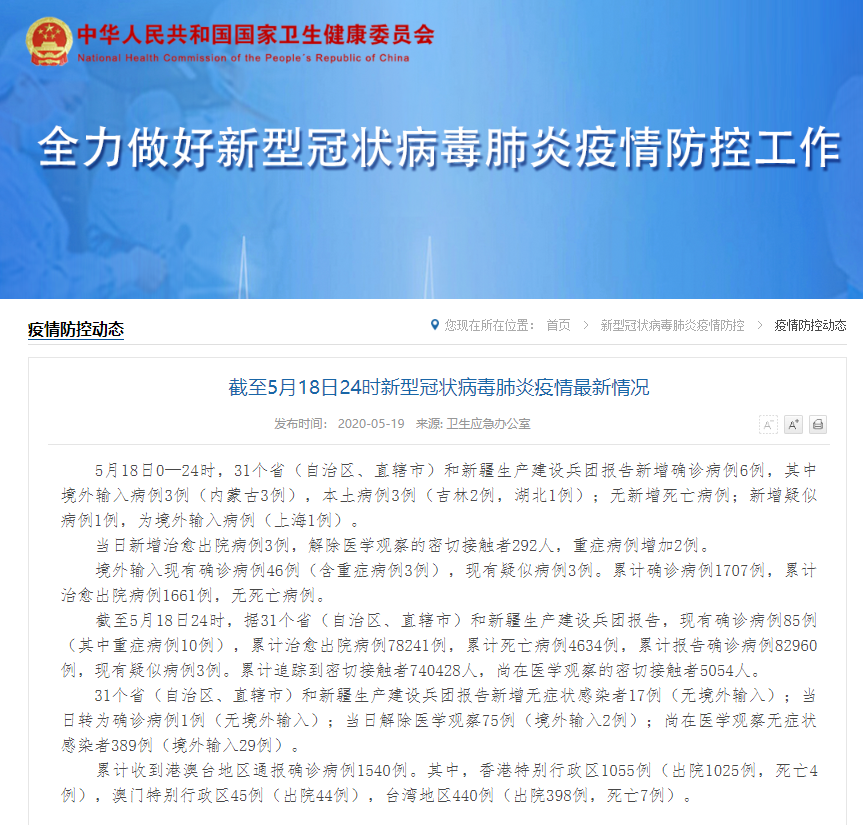 截至5月18日24时,据31个省(自治区、直辖市)和新疆生产建设兵团报告,现有确诊病例85例(其中重症病例10例),累计治愈出院病例78241例,累计死亡病例4634例,累计报告确诊病例82960例,现有疑似病例3例。累计追踪到密切接触者740428人,尚在医学观察的密切接触者5054人。