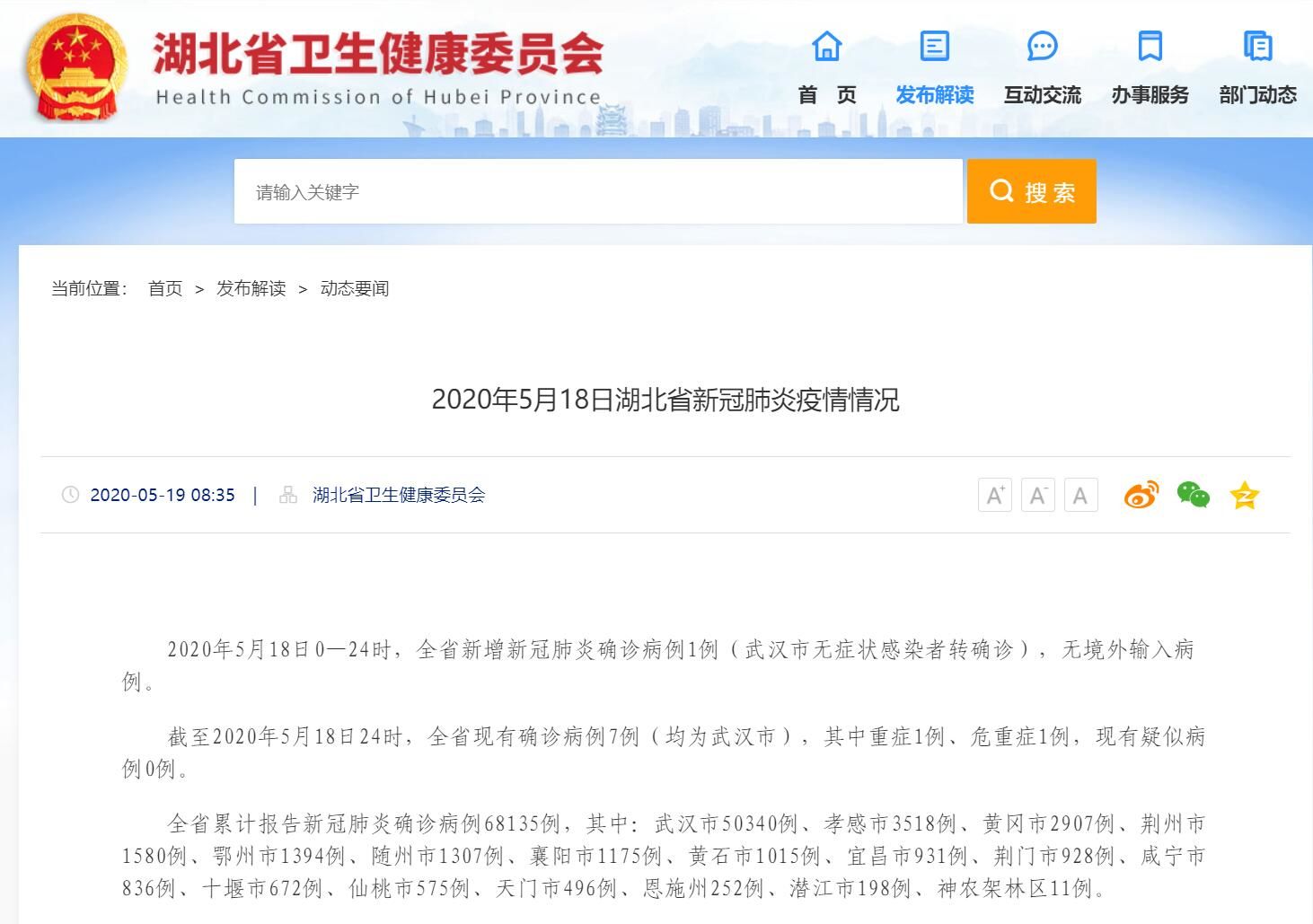 荔枝新闻讯 据湖北卫健委官网消息,2020年5月18日0—24时,湖北省新增新冠肺炎确诊病例1例(武汉市无症状感染者转确诊),无境外输入病例。