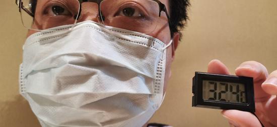 在室温为25℃的通风房间里,记者将电子温度计的传感探头用医用胶布贴在了一名志愿者的右侧脸颊部位。在不戴口罩的情况下,志愿者脸颊处的皮肤表面温度为32.4℃。