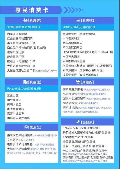“真惠游”消费券包的中签者可随机获得景区免费门票1张,涵盖的景区有:大报恩寺遗址公园、夜瞻园(无演出)、内秦淮河游船票、南京城墙台城景区、南京民俗博物馆(甘熙故居)。还有红山森林动物园、达摩古洞景区、观音景区等,本次活动共计发放免费门票1万张,“真惠游”消费券包的中签者可随机获得景区免费门票1张。