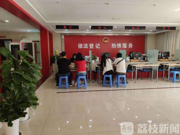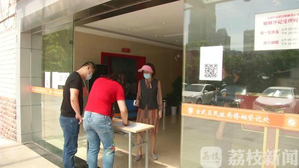 5月19日上午,在南京玄武区婚姻登记处,前来登记的新人必须出示健康码、测量体温、佩戴口罩才能进入大厅办理。工作人员介绍,来登记的新人比平时稍微多一些。新人王佳和于岩飞说,因为疫情,他们一直没来领证,520当天预约太火爆了,所以他们就提前一天来领证。只要两个人高兴,每天都是好日子。新人席冬和李梓纯说,他们一直想挑选一个好日子登记领证,考虑到疫情不聚集,就选择了5月19日,在他们看来“519”的寓意非常不错,长长久久。