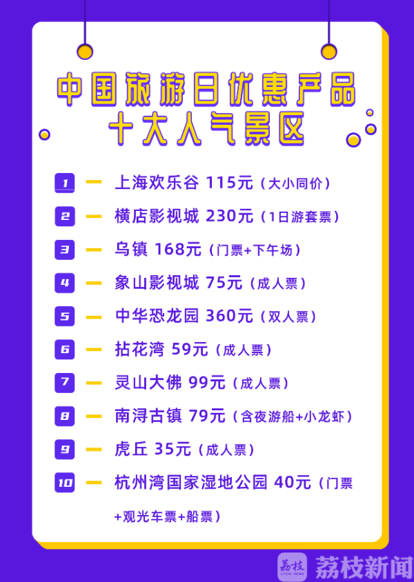 自2011年中国旅游日设立,优惠让利、广泛参与就成为旅游日最鲜明的特点。今年,又有哪些知名景区的产品将推出优惠?数据显示,上海欢乐谷、横店影视城、乌镇、象山影视城、中华恐龙园、拈花湾、灵山大佛、南浔古镇、虎丘、杭州湾国家湿地公园成为当前人气最高的十大景区。