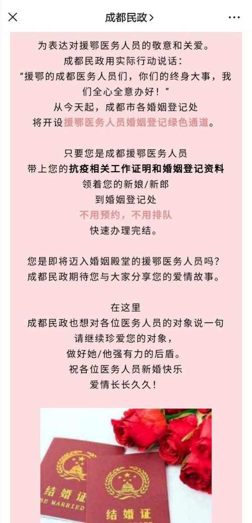 受疫情影响,不少医务工作人员未能如期领证,有的民政局针对医务人员推出了绿色通道。例如成都地区从5月18日起,对于成都参与援鄂的医护人员办理婚姻登记,设置绿色通道,无需排队。