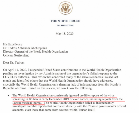 在一封长信中,特朗普洋洋洒洒地列举不少指控该组织“失职”的“证据”,其中还抬出了国际知名医学期刊《柳叶刀》作为依据。