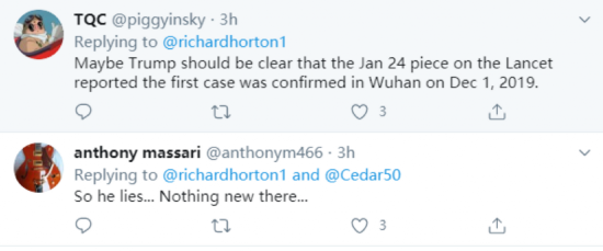 “亲爱的总统先生,您在您攻击世卫组织的内容中引用了《柳叶刀》。但请让我更正一下这里的错误。柳叶刀并没有在2019年12月初发表过任何(关于新冠肺炎的)报道。我们发布第一篇报道来自中国的科学家,时间在2020年1月24日”,霍顿写道。
