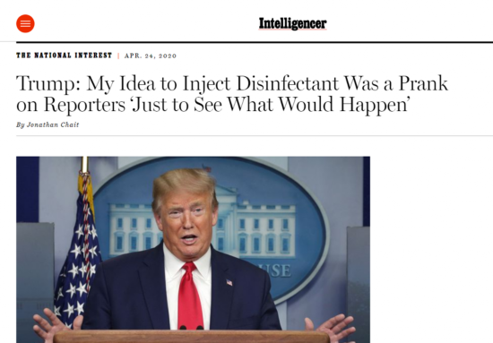 比如,之前特朗普说出新冠肺炎患者可以试试注射漂白剂这种毫不负责、甚至可能导致他人死亡的话后,就曾耍弄这一套路给自己辩解,说自己当时只是在“恶搞”,是“想看看记者会怎么攻击他”。
