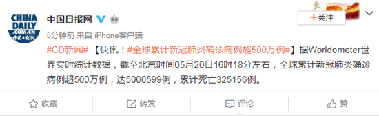 据Worldometer世界实时统计数据,截至北京时间05月20日16时18分左右,全球累计新冠肺炎确诊病例超500万例,达5000599例,累计死亡325156例。