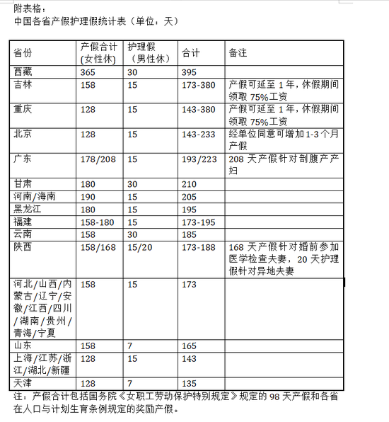 2012年国务院颁布实施的《女职工劳动保护特别规定》中规定,女职工生育享受98天产假,在此基础上,各省在各自的人口与计划生育条例分别规定了奖励产假。奖励产假从30天到80天不等,大部分为60天,最长的是西藏,产假合计365天。