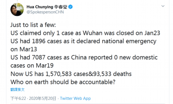 5月20日晚间,中国外交部发言人华春莹连续发布5条推特,摆数据的同时,她质问美方:到底谁该为美国的疫情状况负责?