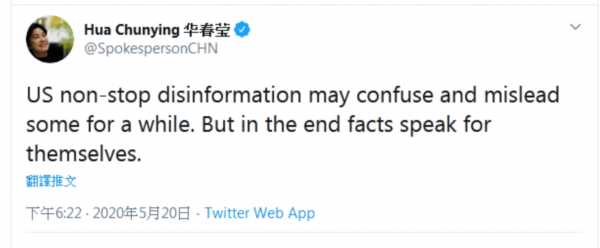 接着,华春莹又写道:“美国不间断的虚假信息在一段时间内可能会迷惑和误导一批人,但最终事实终将证明一切。”