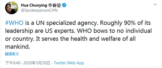 华春莹20日写道:“世卫组织是联合国一个专门机构。大约90%的领导层可是美国专家。世卫组织不会屈从于任何个人或国家,它服务于全人类的健康与福利。”