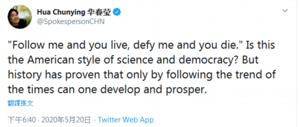 在另一条推特中,华春莹称,“‘顺我者昌,逆我者亡’,这难道就是‘美式科学’与‘美式民主’吗?历史证明,只有顺应时代潮流,才能真正发展与繁荣。”