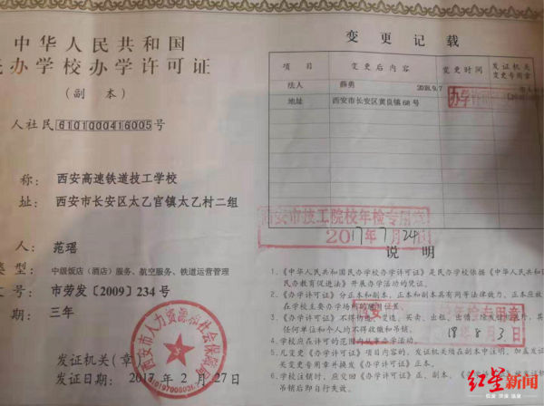 在陈天哲向红星新闻记者展示的该校的办学许可证上,明确显示该校为技工类学校。红星新闻记者通过查询资料发现,“技校”为技工学校简称。技校属于人社部门或劳动部门主管,发技工证和技工学校毕业证书,不是教育部门颁发的学历文凭,在学信网上无法查询到学历信息,只能在人力资源与社会保障部官网进行查询。而全日制普通学校主管部门是教育部门,且会在学业完成后颁发国家承认的学历证书。