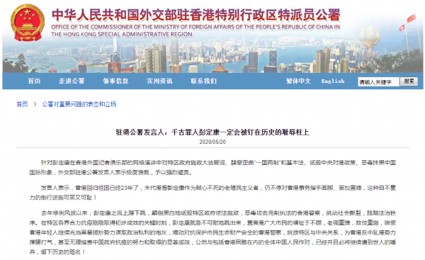 针对彭定康在香港外国记者俱乐部的网络演讲中对香港特区政府施政大放厥词、肆意歪曲“一国两制”和基本法、诋毁中央对港政策、恶毒抹黑中国国际形象,外交部驻港公署发言人表示极度愤慨,予以强烈谴责。