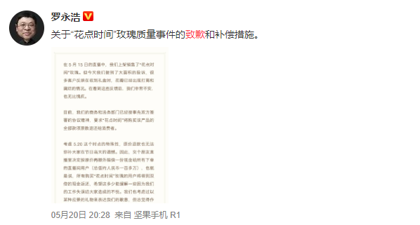 荔枝新闻讯 520当天,有众多网友@罗永浩 称,在其直播间购买的520鲜花有问题。当天下午,罗永浩连转发数十条微博为带货鲜花翻车道歉,并表示正在严肃追究责任。 5月20日晚,罗永浩就此通过微博、微信公众号致歉并发布补偿措施:所有购买“花点时间”玫瑰的用户将得到双倍现金返还。在5月15日的一场直播中,罗永浩直播间上架销售了“花点时间”玫瑰花,但很多消费者在收货后反映花瓣打蔫、腐烂。详情>>