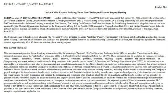 北京时间5月19日晚间,瑞幸咖啡发布公告称,公司收到来自纳斯达克上市资格部门工作人员发出的书面通知,纳斯达克已决定将瑞幸咖啡从纳斯达克摘牌。公司计划要求举行听证会,在听证会召开前,将继续在纳斯达克上市。