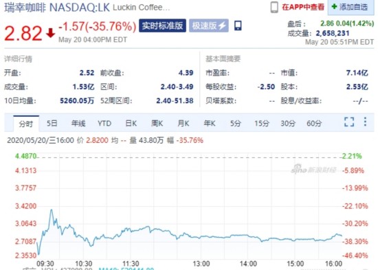 北京时间5月21日消息,已经停牌43天的瑞幸咖啡周三恢复交易,美股开盘后暴跌约40%,盘中跌幅一度达到45%,至2.40美元,为一年前上市以来的最低盘中价格。截至收盘,瑞幸咖啡股价报2.82美元,跌幅35.76%,市值7.1亿美元。该股曾在1月最高上涨至51.38美元,市值最高一度超过120亿美元。当前市值已蒸发超110亿美元,约合800亿元人民币。