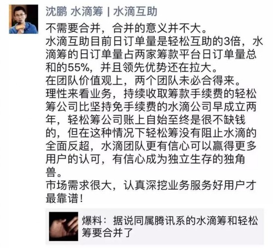 据报道,水滴筹创始人沈鹏在朋友圈直言:不需要合并,合并的意义并不大。