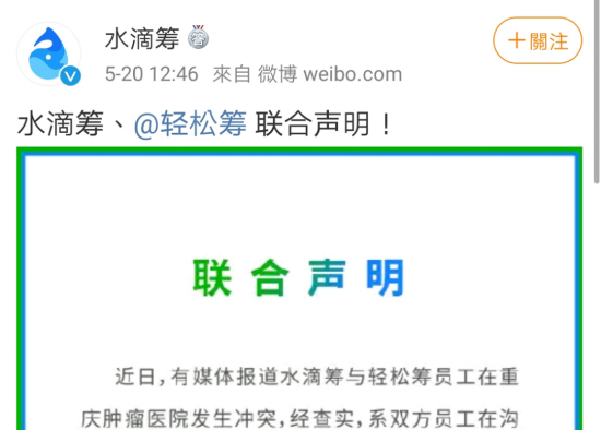 5月20日,针对此前报道“水滴筹、轻松筹员工在重庆肿瘤医院起冲突”一事,双方公司发布联合声明:系双方员工在沟通中因误会产生口角争执,未发生斗殴和受伤,双方已达成和解。