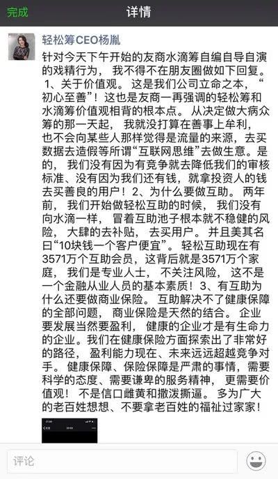 轻松筹CEO杨胤则反击水滴筹价值观不正,将自身当做是流量来源,甚至买数据造假,轻松筹反而“没打算在善事上牟利”“初心至善”。同时解释,轻松互助业务量不高,是为了避免风险。