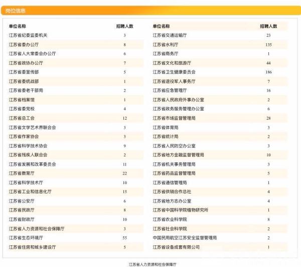 招聘博士研究生或具有副高级以上职称等高层次人才的岗位有15个。招聘人数较多的部门有江苏省卫健委、江苏省水利厅、江苏省生态环境厅、江苏省文化厅。