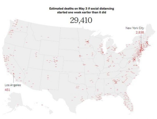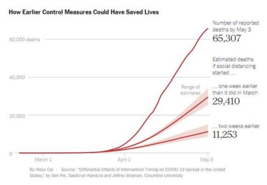 截至5月3日,仅纽约都会区就有2.18万人死亡。研究人员估计,如果封锁措施提前一周,即3月8日实施,到5月3日时,纽约都会区的死亡人数将不会超过4300人;如果提前两周,即3月1日实施,5月3日时全美国的死亡人数将减少5.4万人,即83%的死亡都可避免。